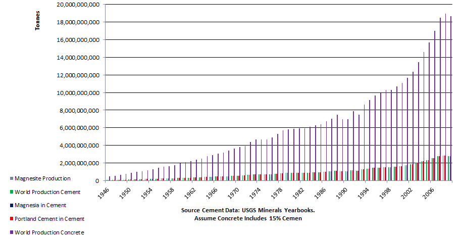 The global statistics for cement and concrete are easier to obtain and considerably more accurate. The data in the graph below is from the USGS Minerals Year Book for Cement[6] and calculated for concrete assuming it contains on average 12% cement[9].