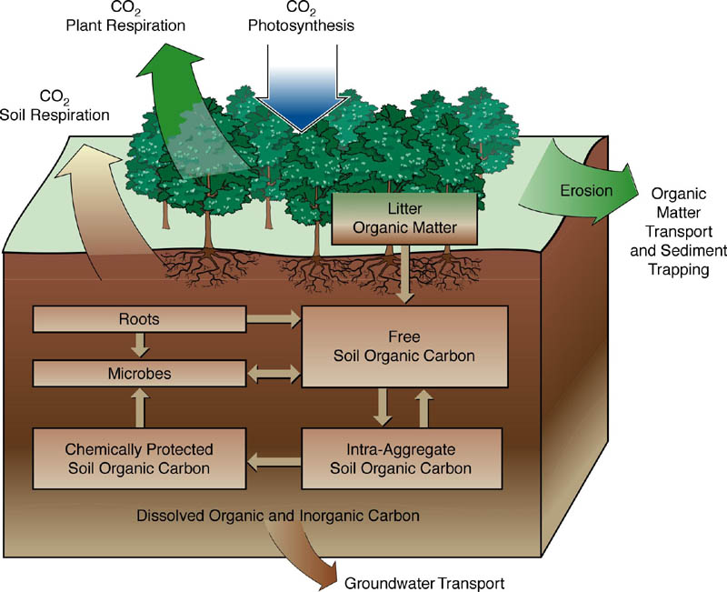 Soils are an important part of the carbon cycle with some two to three times the terrestrial biosphere carbon than plants. Soil processes influence carbon sequestration and transport. The dynamics of carbon transformations and transport in soil are complex and can result in sequestration in the soil as organic matter or in groundwater as dissolved carbonates, increased emissions of CO2 to the atmosphere, or export of carbon in various forms into aquatic systems. The key to sequestration in soils is good management of them and well managed forests and farmlands sequester significant amounts of carbon and as they are then also more productive, sequestering carbon in this way is important[1].