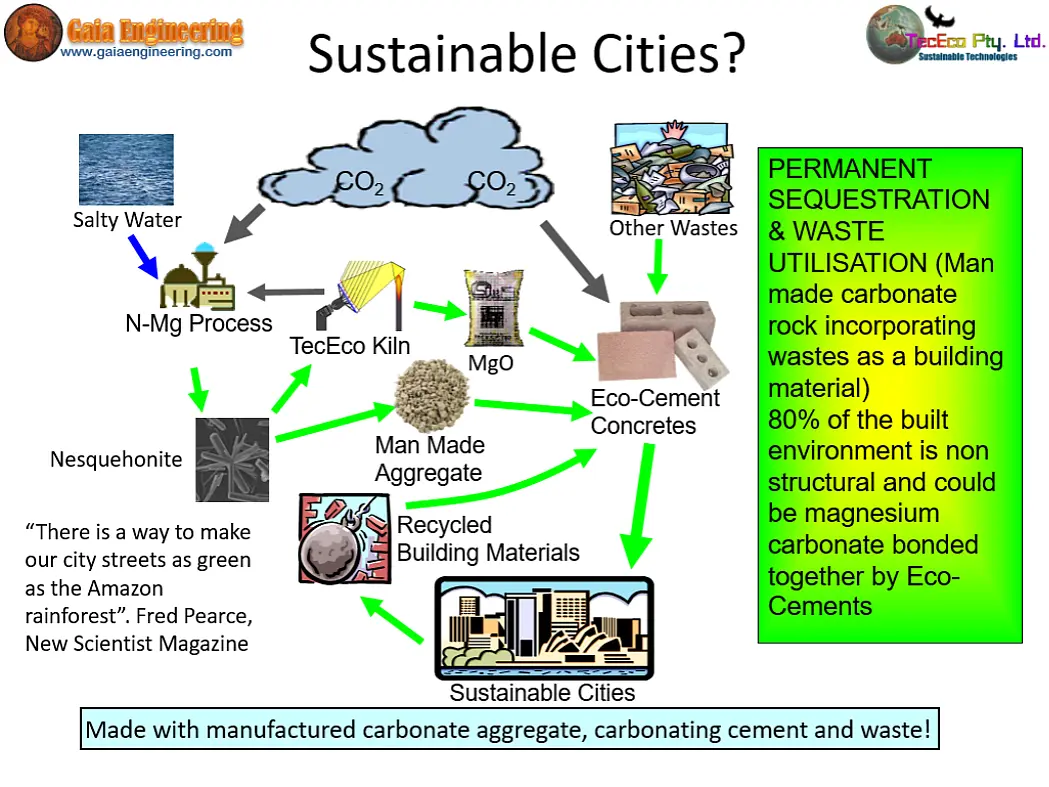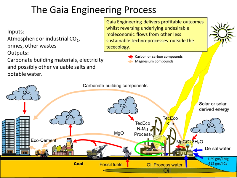 Gaia Engineering involves precipitating CO2 as nesquehonite in the N-Mg process and using it to manufacture synthetic carbonate aggregates with it and other wastes and our patented more sustainable and technically superior binders including Eco-Cement which sets by absorbing CO2. A kiln is under development by TecEco for making reactive magnesia (rMgO), the basis of its binders, without releases and that also generates electricity. Software for implementing the companies cement formulations is being written by a subsidiary company TecSoft Pty. Ltd.
